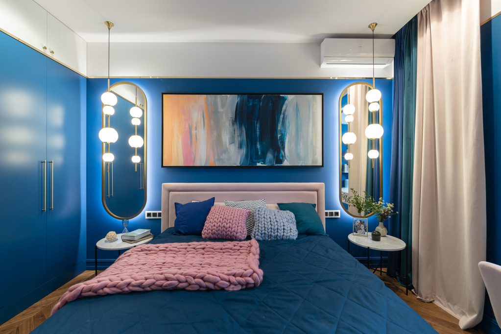 Архитектор Оксана Сальберг-Вачнадзе преобразила интерьер 16-метровой спальни в программе «Квартирный вопрос». Чтобы визуально увеличить пространство использовали прием контрастной покраски стен. Глубокий синий отделила латунная полоска на расстояние от стыка стены с потолком. Лоджия превратилась в кабинет. Проем между зонами обрамили зеркала. Высокий графичный плинтус Base 002, выкрасили в цвет стен.